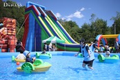 会場には高さ12メートルのウォータースライダーをメインに、多彩なエアー式プールを設置。オープンと同時に子どもたちが列を作り、歓声とともに勢い良く水しぶきを上げました。