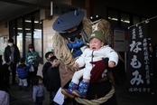 不適切な通報者へのいましめと小正月の伝統行事を重ね、洋野町大野の林郷青年會による「なもみ」に一日警察署長を委嘱。久慈署の後藤署長から赤、青、白の面を被ったなもみに委嘱状と制帽が手渡されました。