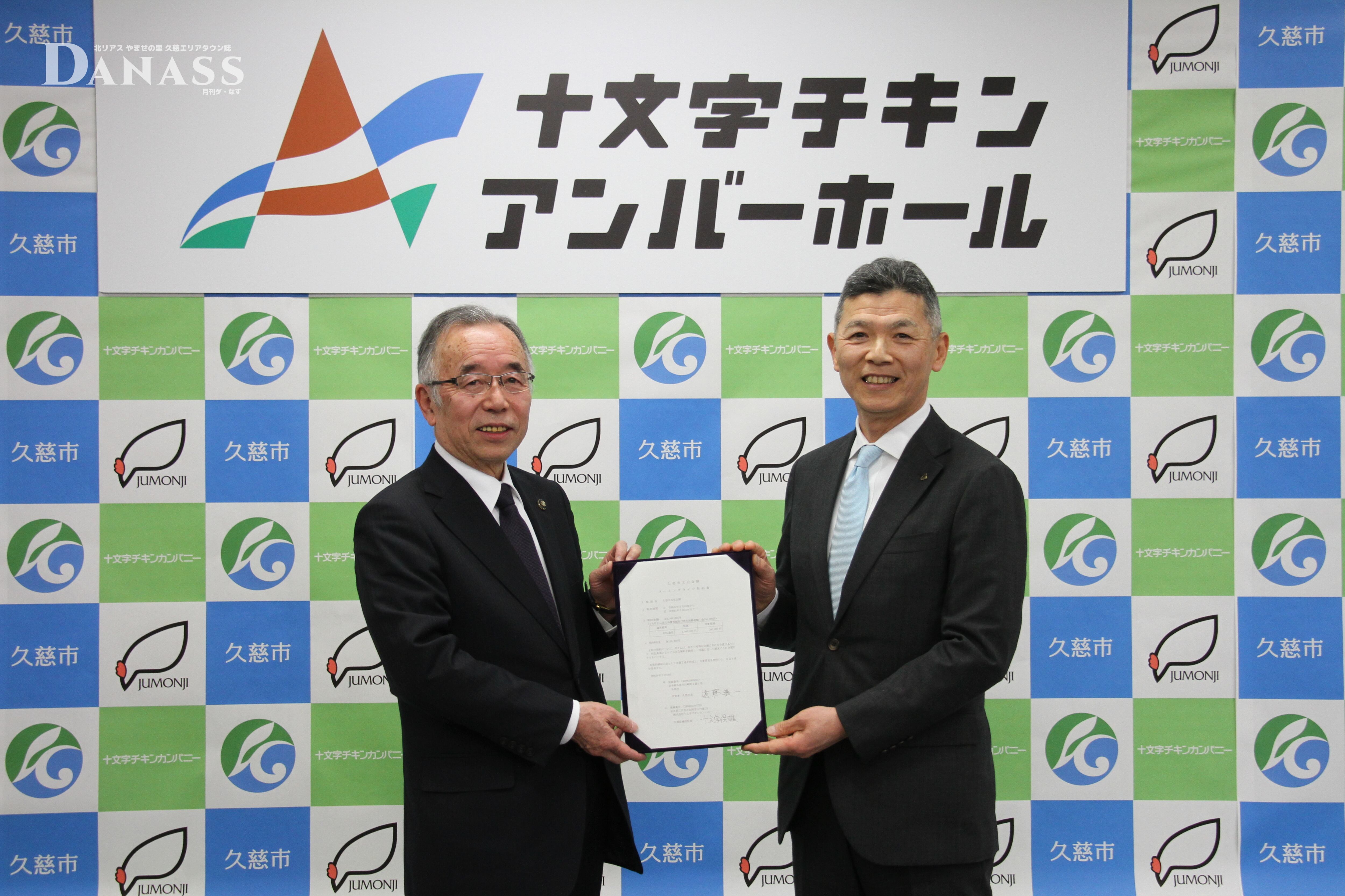 久慈市では新たな財源確保の取り組みとして、市が所有する施設等の命名権を付与する「ネーミングライツパートナー」の募集を行っています。久慈市有施設で2例目となるパートナーとして、久慈市文化会館(アンバーホール)の命名権を二戸市に本社を置く十文字チキンカンパニーが取得。3月10日に久慈市役所で契約締結式が行われました。